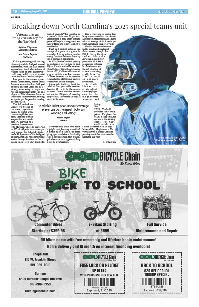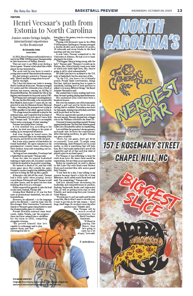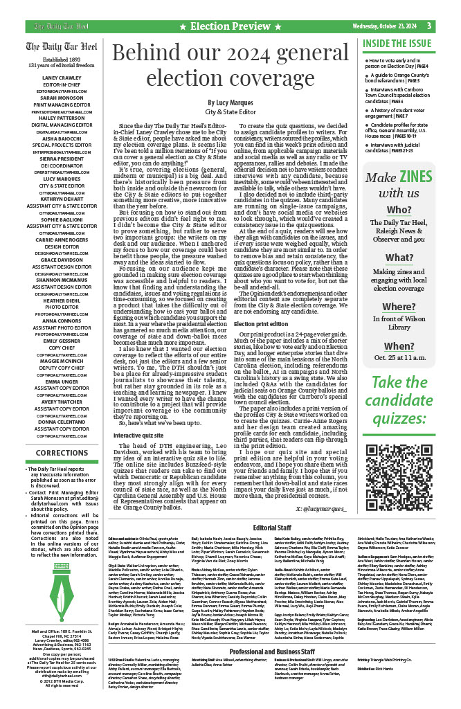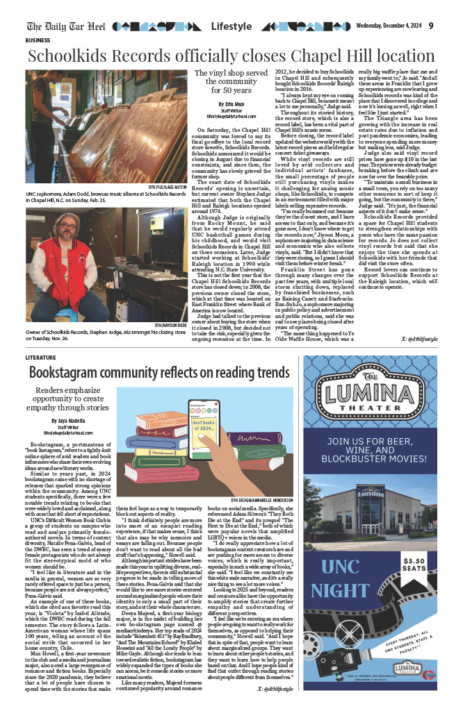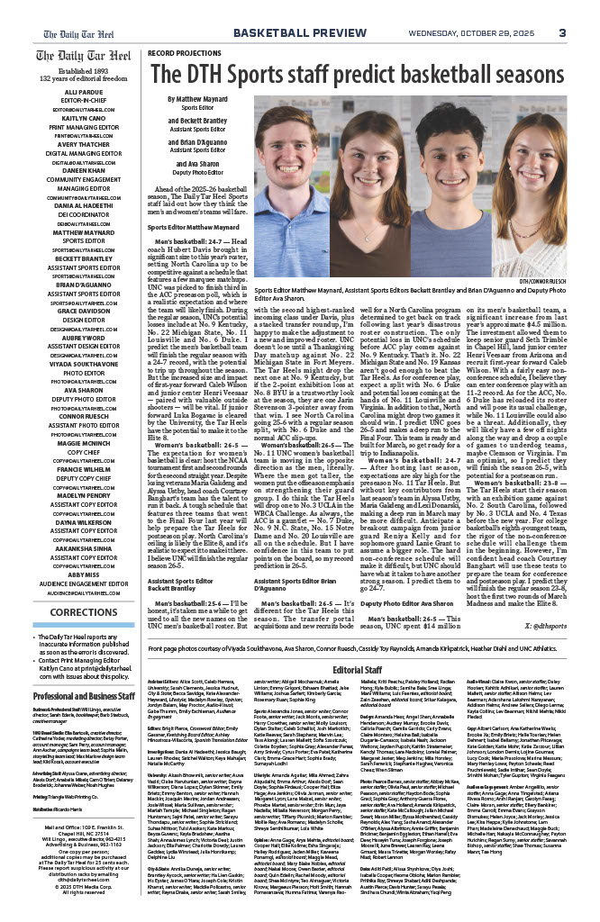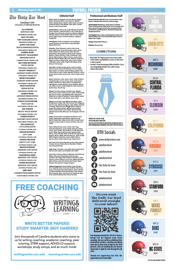 I have helped to produce The Daily Tar Heel’s weekly print paper since August 2024. As a copy editor during the 2024-25 school year, I placed stories on pages, wrote headlines and other copy text, proofread the pages, and so much more. I got to help build the paper from its very beginning each Thursday to the final product in Blue Boxes around campus each Wednesday morning. As one of the managing editors for the 2025-26 school year, I take a more overarching role by helping select which stories will go in the paper each week and overseeing the process of its creation. I also write the horoscopes!