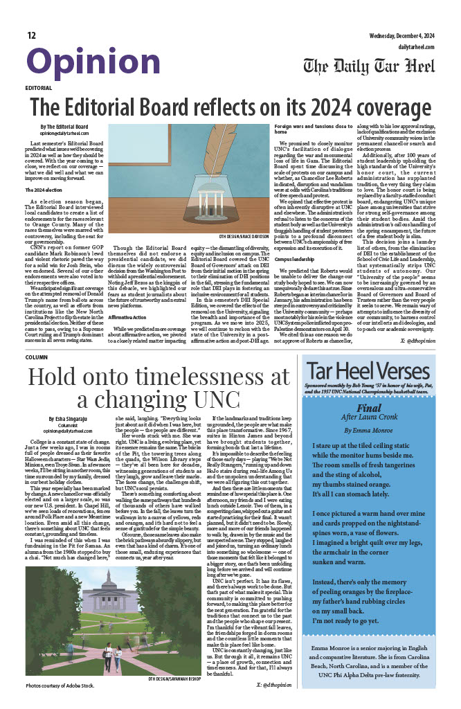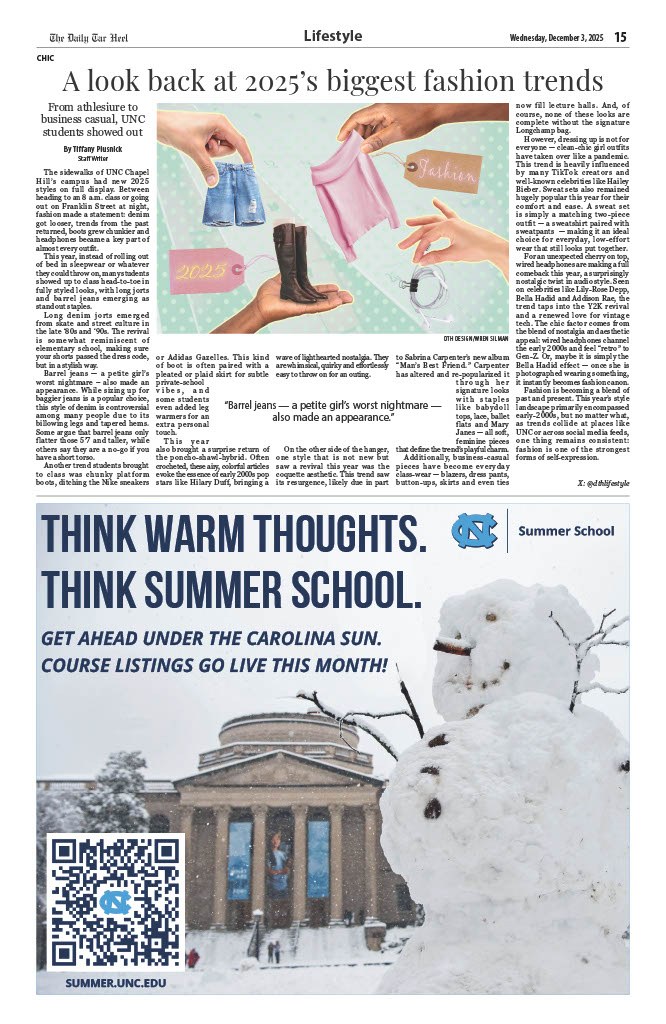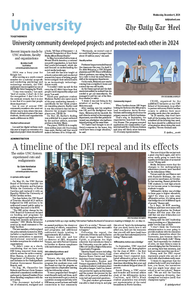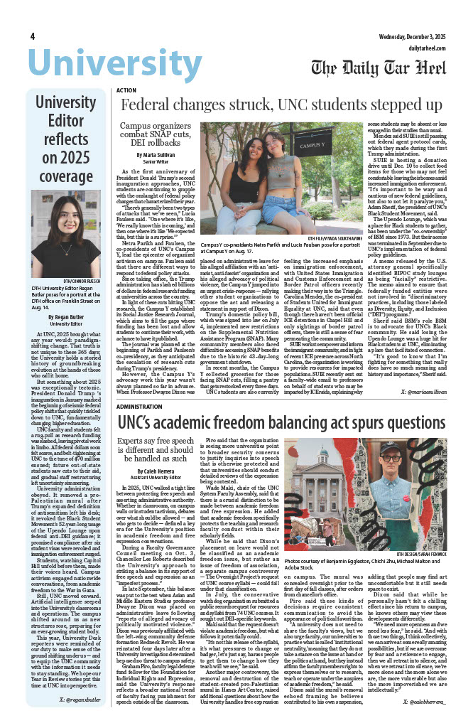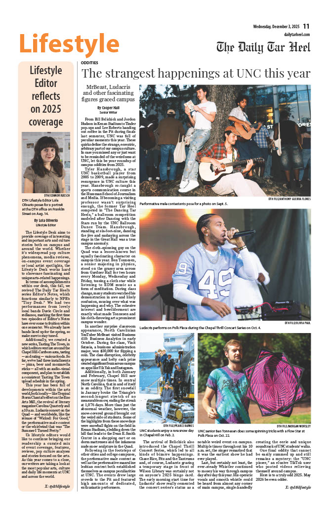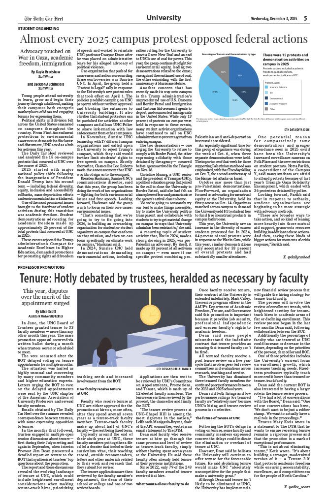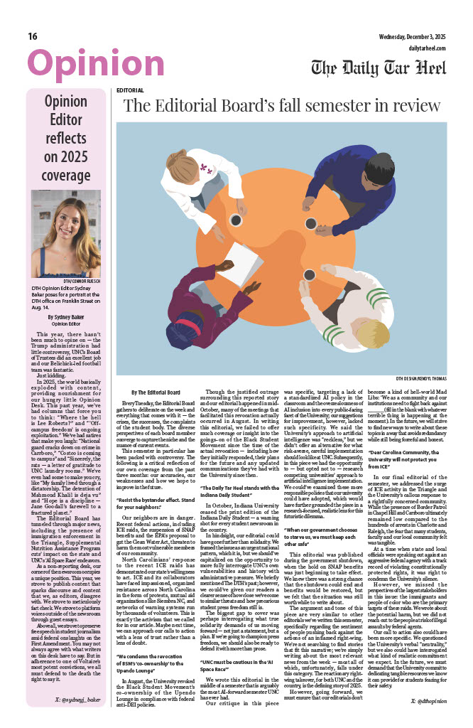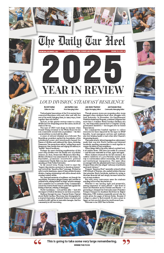 “2025 was a year of fragmentation and divide. And when things shift at the state, federal or global level, it all trickles down. UNC does not reside in a vacuum — and this year reminded us of that, again and again. But with every controversy came students standing tall for what they believe in.”